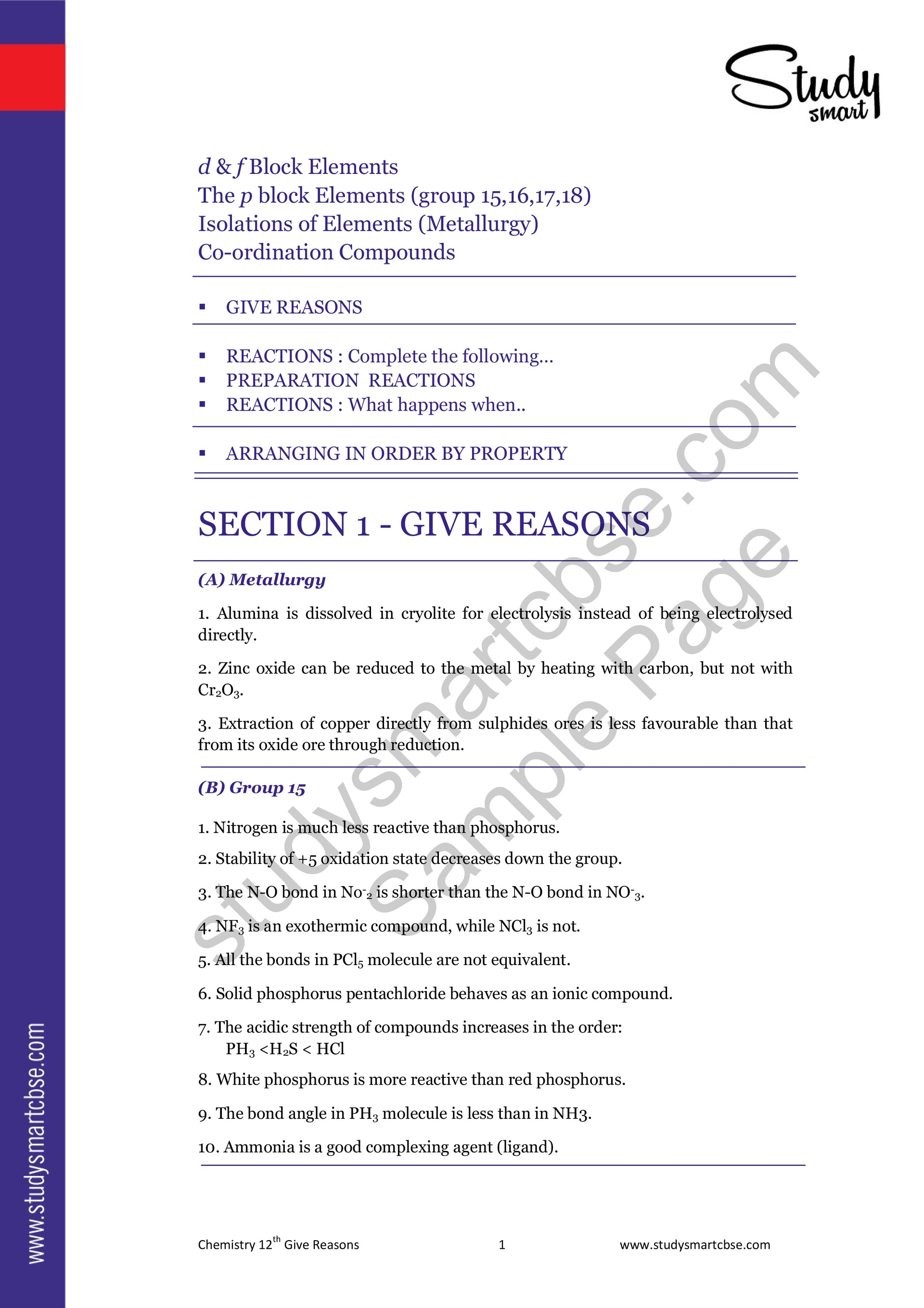 CBSE Class 12th Chemistry | d & f Block Elements, p-Block, Isolation of elements -Important Reactions, Give Reasons